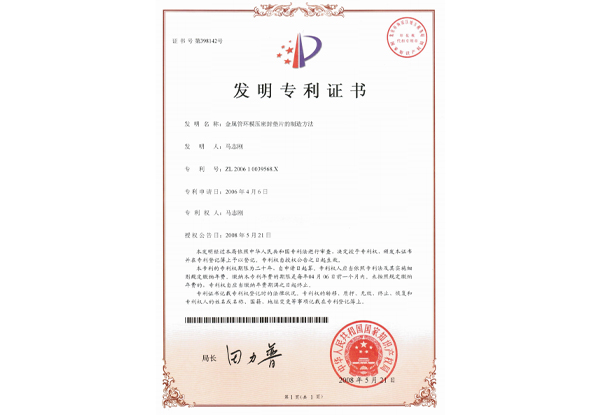 金属管环滚压密封垫片 实用新型专利证书